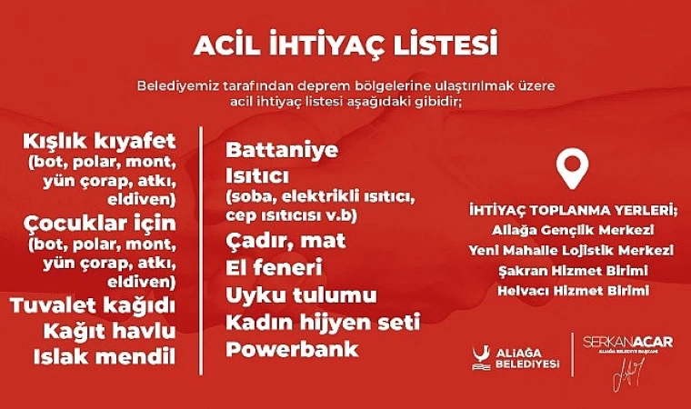 Aliağa Belediyesi, Kahramanmaraş’ın Pazarcık ilçesinde meydana gelen 7,7 büyüklüğündeki depremin ardından İzmir Valiliği ile koordineli bir şekilde yardım kampanyası başlattı. Vatandaşlar, bölgede ihtiyaç duyulan acil ihtiyaç ürünlerini Aliağa Gençlik Merkezi, Yeni Mahalle Lojistik Merkezi, Şakran Hizmet Birimi ve Helvacı Hizmet Birimlerine teslim edebilecek.Aliağa Belediyesi, merkez üssü Kahramanmaraş’ın Pazarcık ilçesi olan ve Kahramanmaraş’ın yanı sıra Hatay, Gaziantep, Kilis, Osmaniye, Malatya, Adıyaman, Diyarbakır, Şanlıurfa, Adana illerimizde yıkıma yol açan deprem sonrası harekete geçerek yardım kampanyası başlattı.Belediye; Kışlık Kıyafet (bot, polar, mont, yün çorap, atkı, eldiven), Çocuklar İçin (çocuk bezi, mama, bot, polar, mont, yün çorap, atkı, eldiven), Tuvalet Kağıdı, Kağıt Havlu, Islak Mendil, Battaniye, Isıtıcı (soba, elektrikli ısıtıcı, cep ısıtıcısı v.s.), Çadır, Mat, El Feneri, Uyku Tulumu, Kadın Hijyen Seti, Powerbank gibi acil ihtiyaç ürünlerini bölgeye ulaştıracak.
