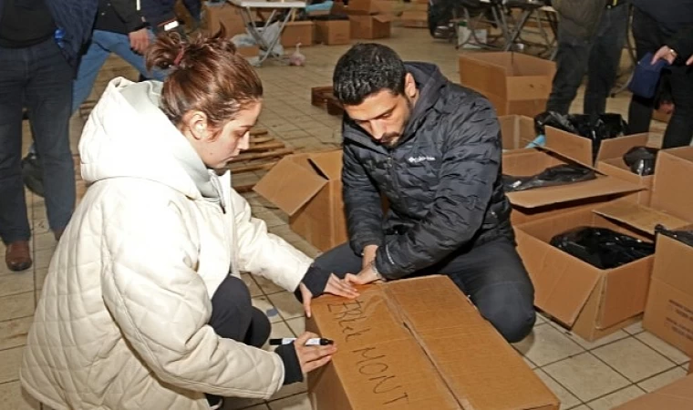 Deprem bölgesine gidecek olan ve Kocaeli genelinden gelen battaniye, ısıtıcı, soba, gıda, giyim ve hijyen maddeleri, eski Carrefour Alışveriş Merkezi’nde kurulan Ayni Yardım Kabul Merkezi’nde toplanıyor. Ayni Yardım Kabul Merkezine gelen yardım malzemeleri, ürün çeşidine göre ayrıştırılıp paketlenerek tırlara yüklenip, deprem bölgesine gönderiliyor. Ürünlerin ayrıştırılması, paketlenmesi ve tırlara yüklenmesinde, Büyükşehir personelleri, gönüllüler ve diğer vatandaşlar canla başla sabahlara kadar çalışıyor.