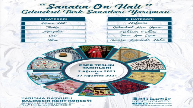 Geleneksel sanatların gelişimine ve tanıtılmasına katkı sağlamak amacıyla Balıkesir Büyükşehir Belediyesi ile Balıkesir Kent Konseyi işbirliği içerisinde “Sanatın On Hali-Geleneksel Türk Sanatları Yarışması” düzenleniyor. Yarışmaya eser teslimi, 2-27 Ağustos günleri arasında yapılacak.