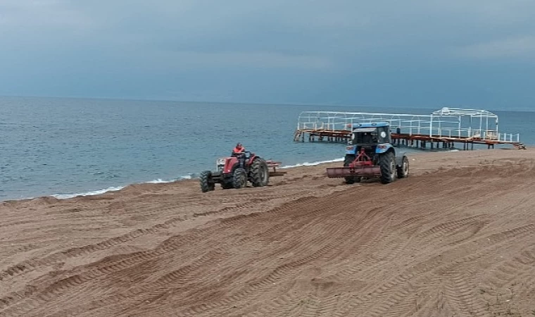 Özellikle kış şartlarında denizde yaşanan gel git olaylarıyla sahile vuran yabancı maddeler ve sertleşen plaj kumlarının taranarak temizlendiği çalışmalarda, tüm kumsal çöplerden de arındırılarak havalandırılıyor.