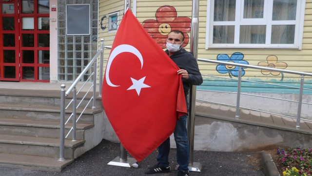 Sivas’ta bir anaokulunun bahçesinde bulunan Türk bayrağının yere düştüğünü gören duyarlı vatandaş, bayrağı yerden alarak dakikalarca yerine takmaya uğraşıp başında bekledi.