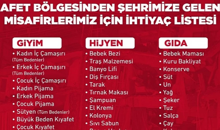 Yayınlanan çağrıda kente afet bölgesinden gelen vatandaşlar için Sosyal Yardım İşleri Müdürlüğü’nde toplanan giyim, hijyen ve gıda ürünleri afetten etkilenen vatandaşlara teslim edilecek. Hijyen gereği sadece hiç kullanılmamış malzemeler kabul edilecek.