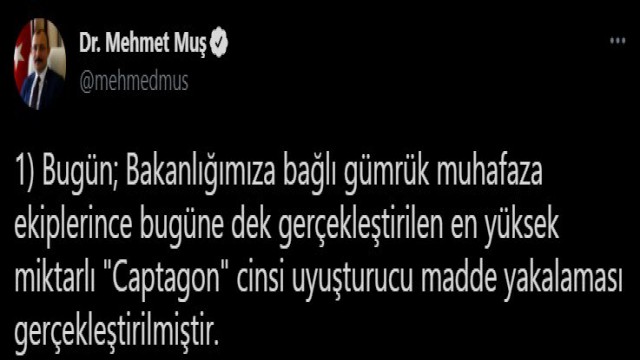 Ticaret Bakanı Mehmet Muş, Gümrük Muhafaza ekiplerince Hatay’da 6 milyon 264 bin 259 adet ile rekor sayıda “Captagon” cinsi uyuşturucu ele geçirildiğini duyurdu.