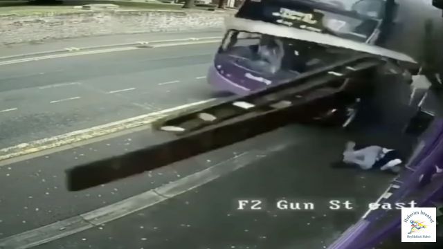 Virajda hızını alamayan çift katlı otobüs yol giden adama vurarak onu metrelerce yukarı savurdu. Çarpmanın etkisiyle metrelerce uçan adam herkesi şaşırttı. Yerden hiçbirşey olmamış gibi kalkan adam dükkanın içine sakin bir şekilde giriyor.