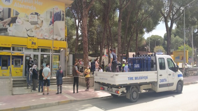 izmir’in Tire ilçesinde maaşlar, yardım ve destek ödemeleri için PTT’ye giden vatandaşlar kalabalık oluşturunca polis duruma müdahale etti.