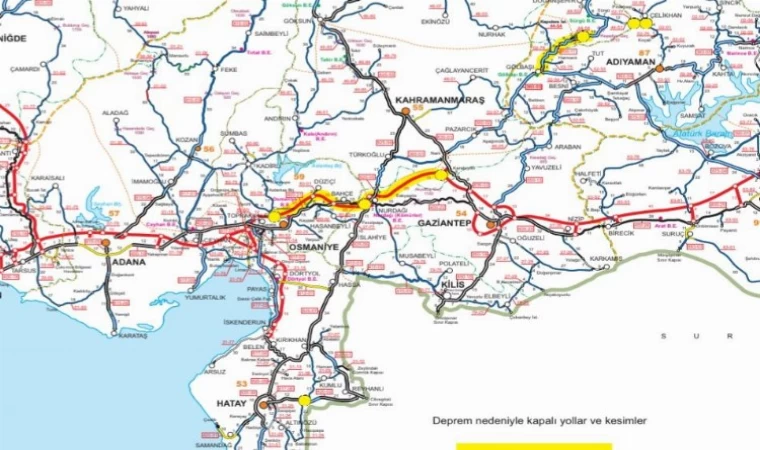 Karayolları Genel Müdürlüğü, deprem dolayısıyla kapanan yollar ve alternatif güzergahlara ilişkin harita yayımladı.