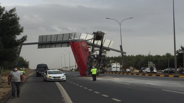 GAZİANTEP’TE BİR KAMYONUN DAMPERİ KALKARAK YUKARIDAKİ YOL İŞARETİ TABELASINA ÇARPTI. ÇARPMANIN ETKİSİYLE KAMYONUN DAMPERİ KOPARAK HAVADA ASILI KALIRKEN OLAYDA ÖLEN YA DA YARALANAN OLMADI.