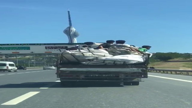 D-100 Karayolunda üzerinde Kadıköy yönüne doğru seyir halindeki bir kamyon, sürücülerin dikkatini çekti. Karton yüklü kamyonun kasasındaki 6 kişi, yüklerin üzerine oturarak korunaksız bir şekilde seyahat ederken, o anlar başka bir sürücü tarafından kayda alındı. Kamyon kasasında, hurda yüklerinin üzerine oturan 6 kişinin rahat tavırları ise dikkat çekti.