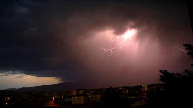 Hakkâri’nin Yüksekova ilçesinde akşam saatlerinde etkili olan sağanak yağış sırasında çakan şimşekler hem korkuttu hem de görsel şölen sundu.