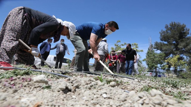 Burdur Valisi Ali Arslantaş, tarlada çapa yapan kadınlarla birlikte çapa yaptı.